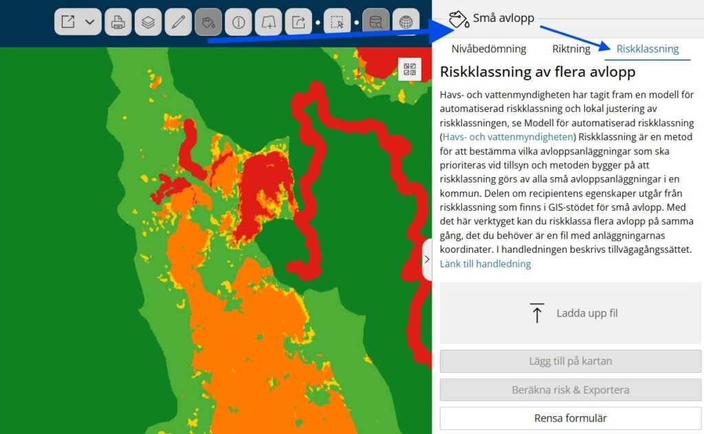 I kartan finns en ny ikon för små avlopp, hinken med droppen. Om du sätter pekaren på den och det står Small sewage vet du att du träffat rätt. Verktygslisten tänds till höger och där finns verktyget Nivåbedömning för högsta grundvattennivå, Riktning för bedömning av strömningsriktning och Riskklassning.