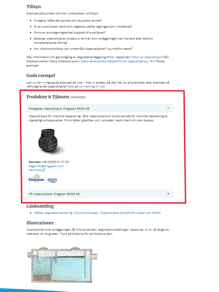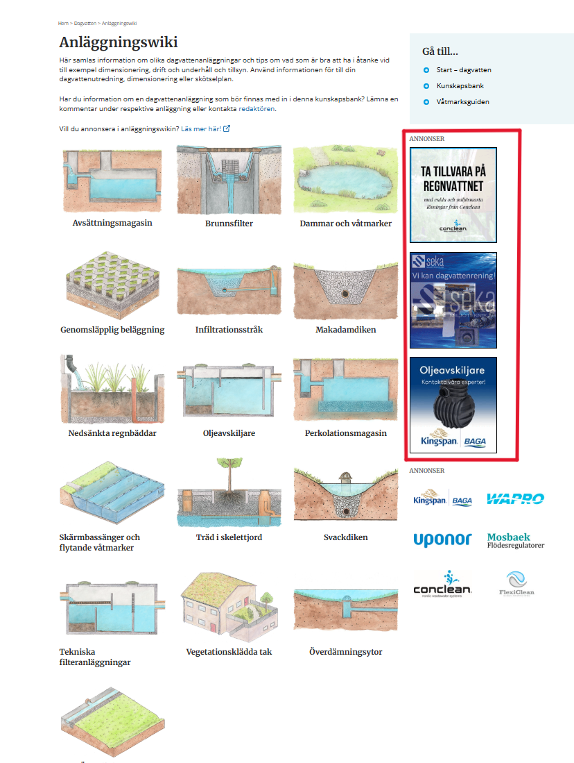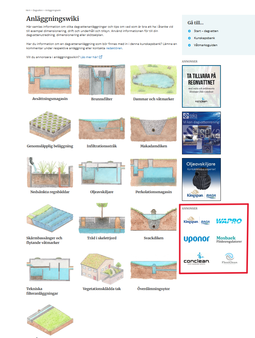 Annonsering av ditt företag eller din produkt på VA-guiden sker via vår sida anläggningswiki för dagvattenanläggningar på vaguiden.se. Anläggningswikin samlar kortfattad information och tips om vad som är bra att ha åtanke vid exempelvis dimensionering, drift, underhåll och tillsyn av olika dagvattenanläggningar. Wikins användare har också möjlighet att påverka innehållet och bidra med ny information om de olika anläggningstyperna. På så sätt hålls informationen uppdaterad och sidorna förblir aktuella över tid.