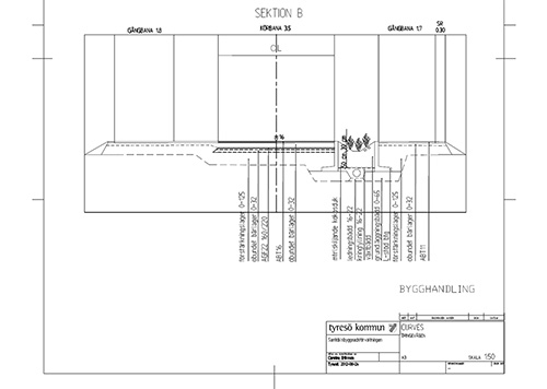 Vatten leds in till växtbäddarna via öppningar i stödmurar och kantsten. Överskottsvatten avleds sedan till dräneringsledning via kupolbrunn. Även dagvattenbrunnar och nedstigningsbrunnar finns i systemet.