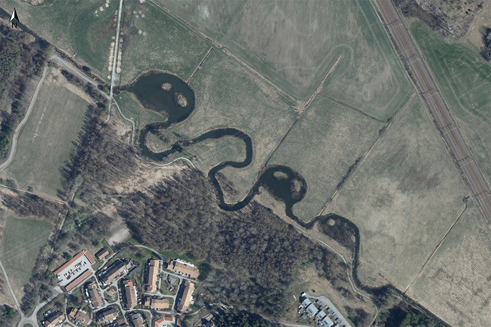 Söder om ån följer en gång och cykelväg meandringen. Karta