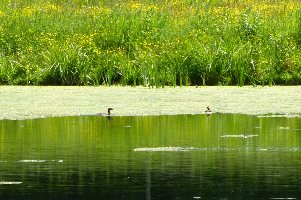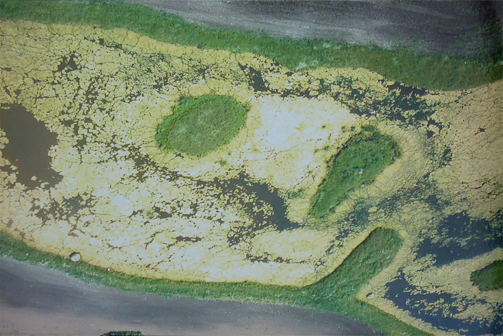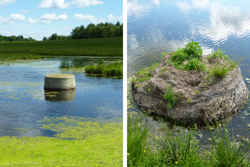I dammen har Åke lagt i ett antal kornhalmsbalar för att motverka algtillväxten. Han tycker att det har gett bra effekt. Flygfotot från 2009 visar hur mycket alger det var då. Då hade de 3-4 rundbalarna med halm som legat i våtmarken i 10 år sedan länge tagit slut. I år har han lagt i nya balar och mängden alger är betydligt lägre igen. 2009 kan ha varit ett extremt år eftersom grävningarna året innan kan ha satt fart på algtillväxten. I år finns mer annan undervattensvegetation som konkurrerar om näringen
