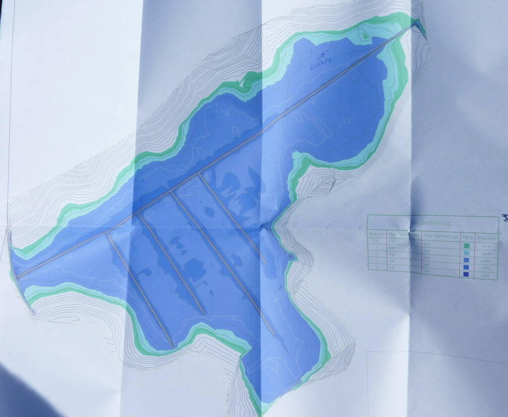 Djupkarta över våtmarken visar att största delen ligger mellan 0,6-1,2 meters djup (ljusblått). De gamla dikena ligger kvar.